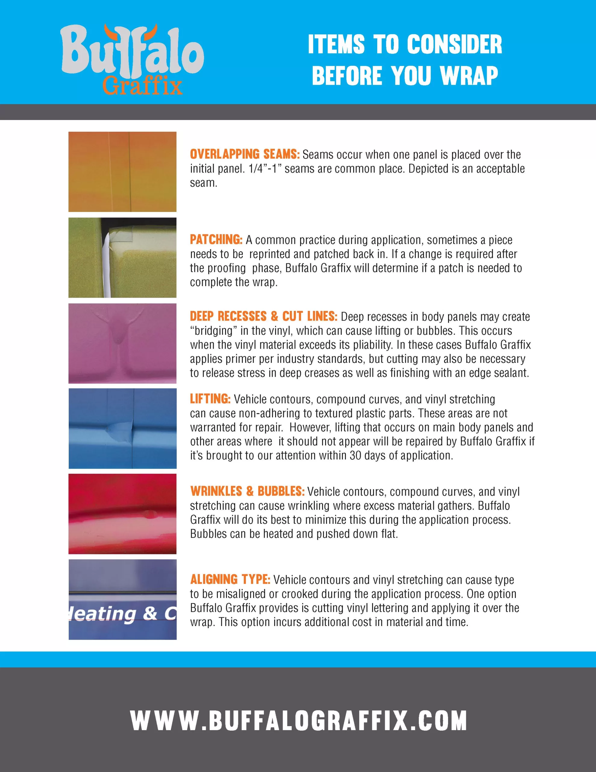 I have read and understand the application considerations and Pre-Wrap Checklist. I agree that if my vehicle is not clean and properly prepared for a wrap installation, Buffalo Graffix reserves the right to incur additional charges of $80 per hour to compensate for cleaning time and supplies. I understand that the longevity of my wrap and its appearance over time will depend on a number of factors including, but not limited to, weather & local climate, road conditions, daily use, and overall initial condition of the vehicle’s surfaces before wrap installation.